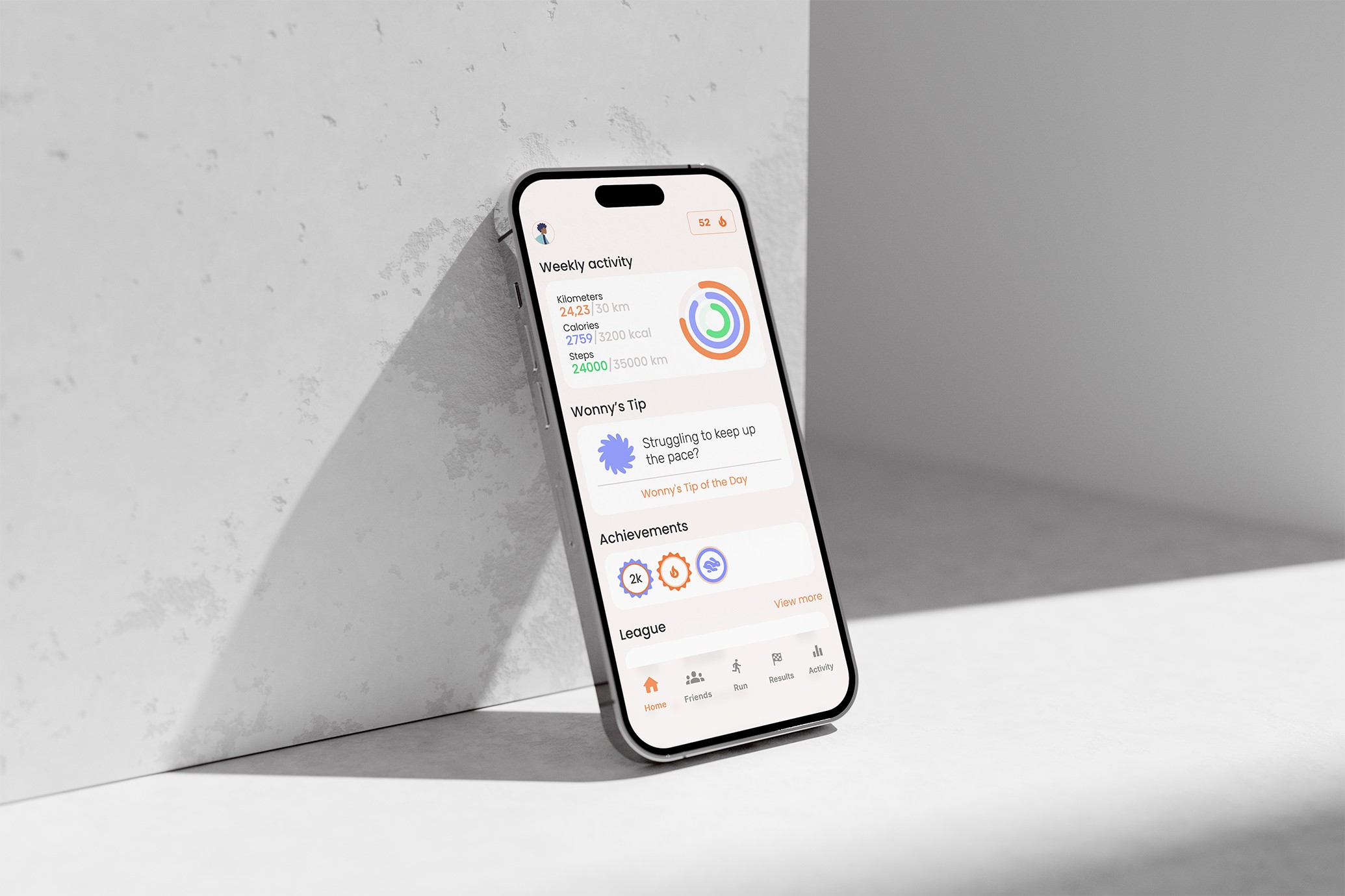The app was developed with a focus on gamification, allowing users to accumulate points and improve their league position through their running activity. A reward system was implemented to keep users motivated and engaged with their physical activity.