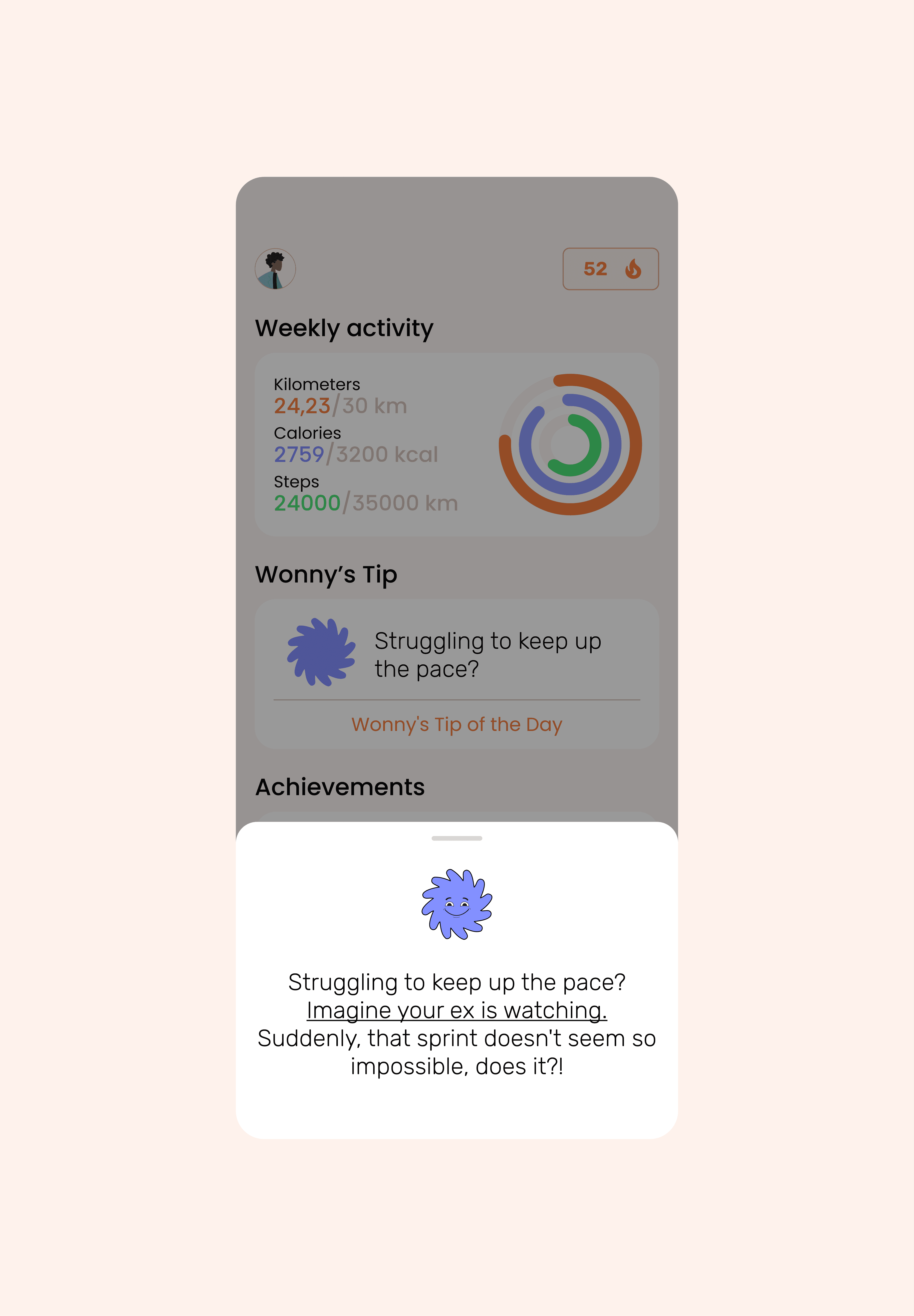 Wonny is an innovative running app that combines a passive-aggressive virtual mascot with a gamified competition system to motivate users in a fun and unique way.